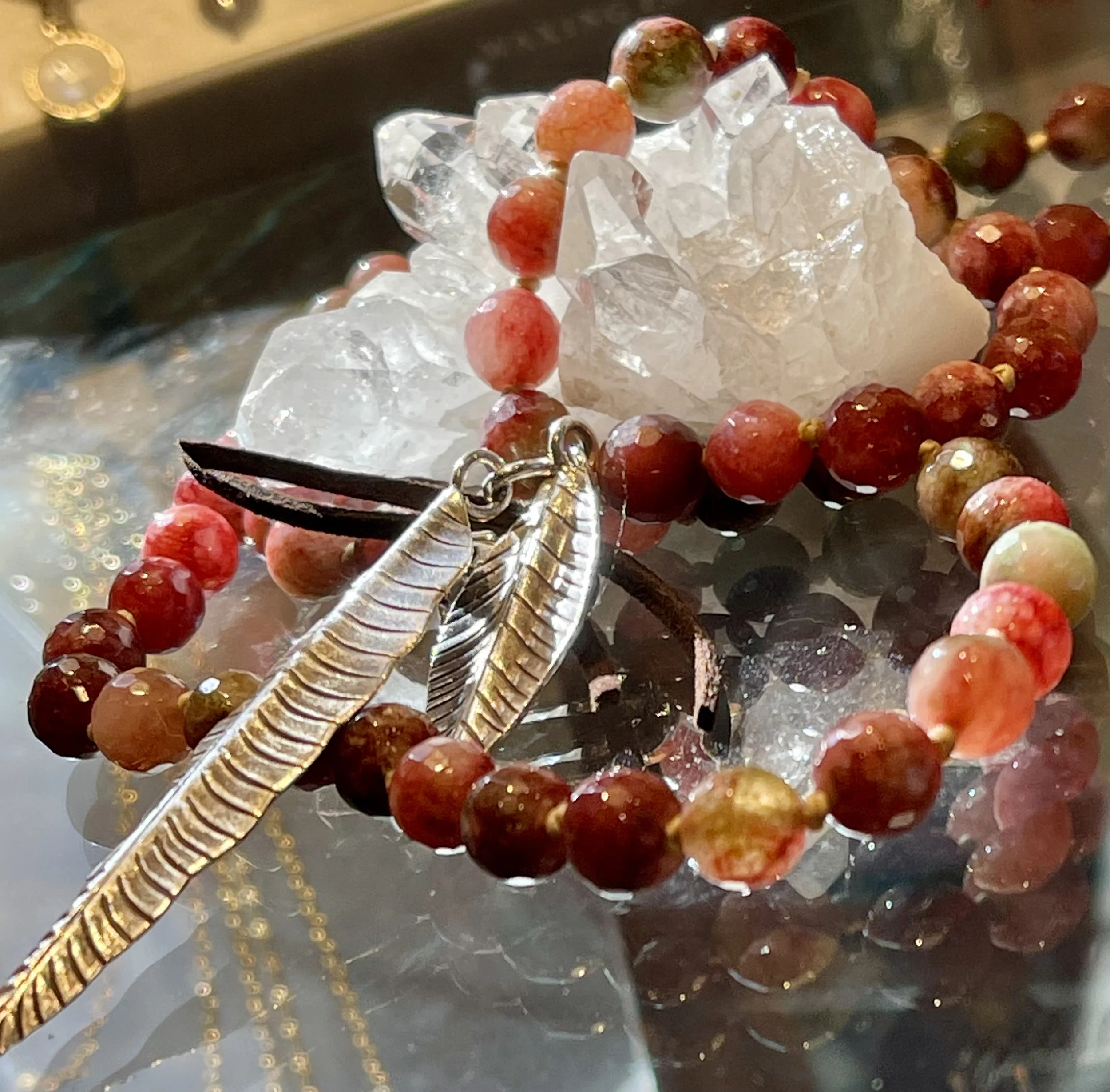 Local Menlo Park artisan Donna designs with an eye that speaks of texture and color of hand-selected beads and materials. A little bit boho, tribal, ethnic, and always joyful to wear! She tells a bold story with an element of fun, her question always being would she wear it herself? We feel Donna connects with her past lives, with joy in her heart when she loses herself in the process of creating and becoming one with her designs.